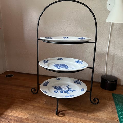 2-etagers kageopsats i porcelæn blå hvid med træhåndtag