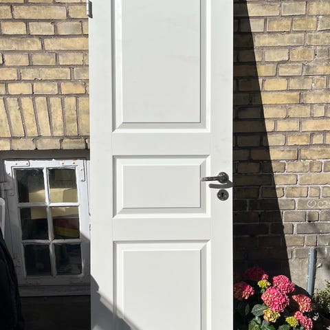 Swedoor formpresset indvendig dør i modellen Style 03 i hvid, str 625x2040 mm (7x21). Klassisk fyldningsdør med greb og låsekasse monteret.