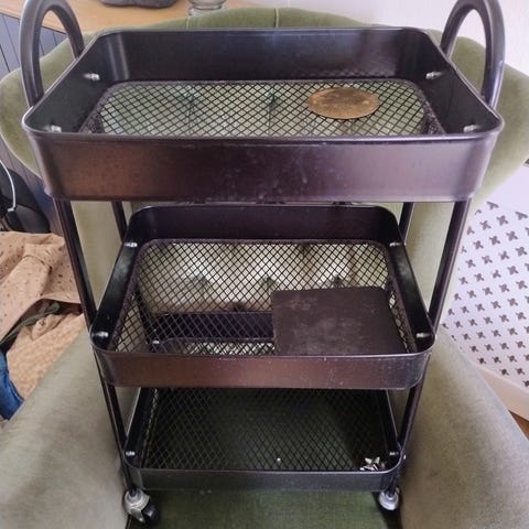 Sort rullevogn med tre metalbakker i net og høje kanter. Står på hjul, så den er nem at rulle rundt og bruge til opbevaring flere steder i hjemmet.