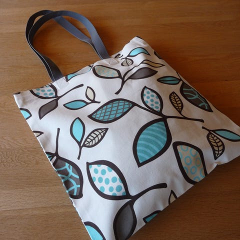 Nyt indkøbsnet / totebag og en lille stofpose, syet i nyt bomuld, med trykt af roser og blade, på lys blå bund.