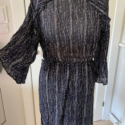Blå festkjole fra Chilia i str 40 i polyester med kontraststykker ved skuldrene. Har lynlås i ryggen og en skrålomme i siden.