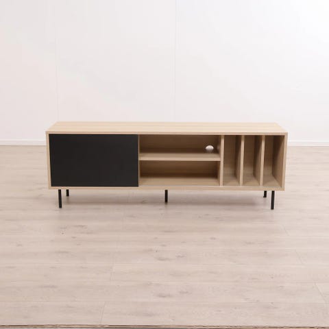 IKEA BYÅS tv-bord i højglans hvid med to skydelåger og åbne hylder i midten. God plads til tv-udstyr og opbevaring bag lågerne.