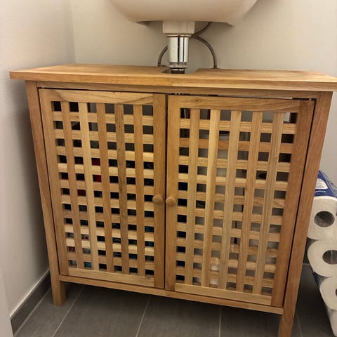Fin træbænk med lameller, god som siddeplads eller til håndklæder. Passer godt ind i badeværelse eller entre og er nem at tørre af.