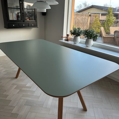 Sælger dette flotte, unikke spisebord i massivt egetræ med en stilren, grøn linoleumsoverflade. Bordet er nybygget og fremstår i virkelig høj kvalitet med et moderne, nordisk look.