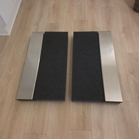 Bang & Olufsen passive højttalere i grå stof med plaststriber på fronten. Har rektangulær form og kan hænges tæt sammen for et samlet udtryk på væggen med et væg beslag (medfølger ikke)