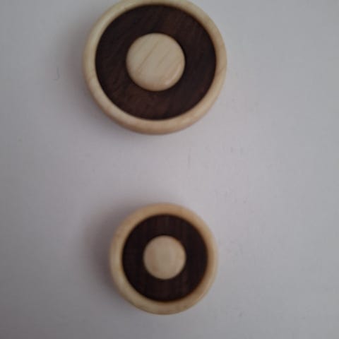 Én gul knap på 2,2 cm, og en sølv knap på 2 cm, begge i samme design