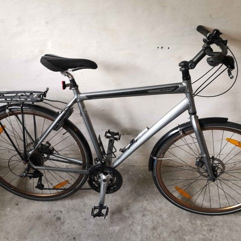 Grå hybrid cykel i perfekt stand.