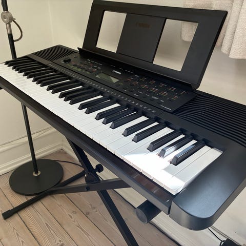 Yamaha YPT-255 keyboard med fuld klaviatur og indbyggede højtalere. Med justerbart stativ og strømforsyning, klar til at blive sat op derhjemme.
