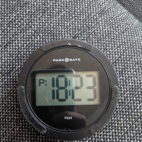 Elektronisk ParkOne p-skive i sort med digitalt display og tre knapper på forsiden. Bagsiden har Citroën-logo og mærkede timer omkring kanten.