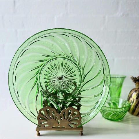 Oval skål af presset, grønt glas med blomsterpræg