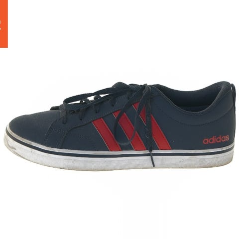Et par sort Adidas løbesko med Cloudfoam teknologi, som giver ekstra komfort. Skoene har et let mesh-materiale på toppen og en solid hvid sål. Adidas-logoet er synligt både på tungen og på siden af skoen. Størrelsen er 45,5.