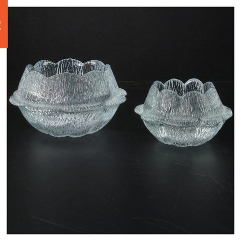 To små, gennemsigtige glas askebægre med blomsterdesign. Fremstår let brugte, men uden skader.