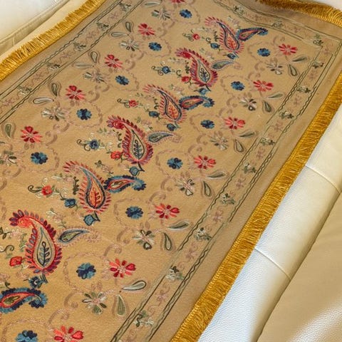 Vær venlig at betragte tæppet med tålmodighed og opmærksomhed. Hvert håndlavet tæppe er unikt i sit mønster, sin skønhed og farveharmoni og derfor et kunstværk i sig selv. (Farven er lysere eller mørkere afhængigt af vinklen.)