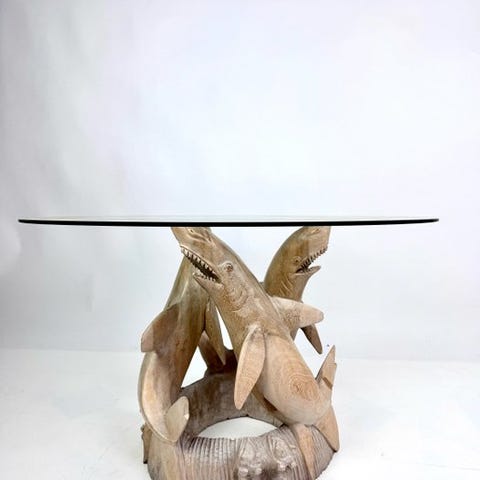 Et håndlavet sidesbord i massivt teaktræ. Denne genstand er ikke blot et møbel, men en rigtig træskulptur, der forener figurativ kunst og funktionalitet.