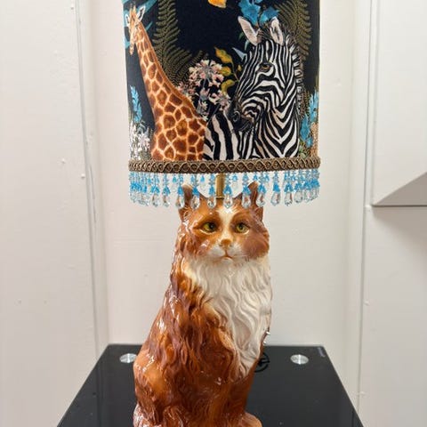 Keramik bordlampe i form af en fransk bulldog med zebra-mønster, med en gul velour-skærm dekorret med blomster og sommerfugle samt perlekant, monteret på en keramisk base med messingbeslag og tekstilskærm, fremstillet i Italien, i næsten ny stand og i funktionsdygtig stand, højde 47 cm, fod 30 x 28 cm, E27 fatning. Klik på den blå "gå til varen" knap, for at købe eller byde på denne vare. Den samlede pris vil blive vist inden du afgiver dit bud.