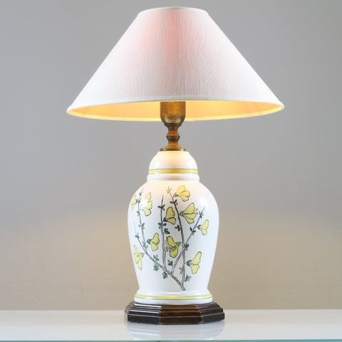 Italiensk bordlampe i forgyldt messingin fra 1960’erne–1970’erne, med en solid messingbas i guld og en cylindrisk tekstilskærm med varme nuancer af orange, beige og lysegrønne bånd, dimensioner 33 cm bred, 33 cm dyb og 58 cm høj, i meget god stand med få aldersrelaterede tegn, original ledning fungerer ikke. Klik på den blå "gå til varen" knap, for at købe eller byde på denne vare. Den samlede pris vil blive vist inden du afgiver dit bud.