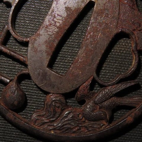 En smedet jern tsuba fra Edo-perioden i Japan, signeret Bushu Ju Masanao, med chrysantemumblomstmotiv og guldbelægning, måler 7,2 × 7,1 × 0,46 cm, i god stand. Klik på den blå "gå til varen" knap, for at købe eller byde på denne vare. Den samlede pris vil blive vist inden du afgiver dit bud.