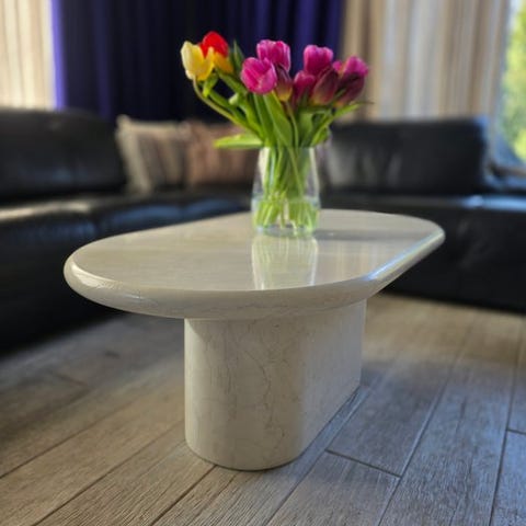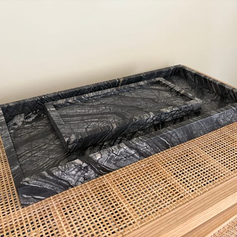 Denne lille mørkegrønne marmorsidesbord er bare helt utroligt. Når du er kommet til hægterne igen, lad os gå i detaljer. Kombinationen af metal og marmor gør dette bord fuldstændig forbløffende. Og nævnte vi