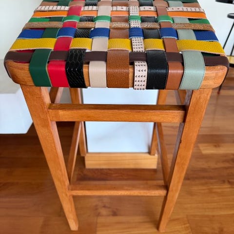 Stolen havde ikke noget sæde, derfor opstod idéen om at bruge farverige, gamle remme.