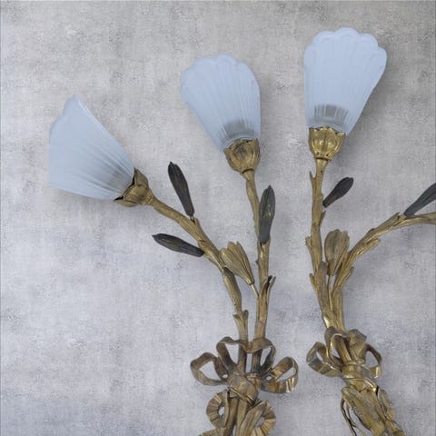 Elegant væglampe med to lys, raffineret udtryk for italiensk håndværk, kendetegnet ved en blomsterkomposition med stor scenografisk effekt.