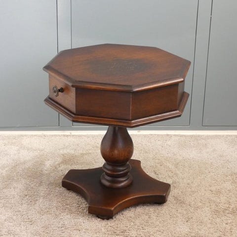 THE FOREST Art & Woodworking Studio præsenterer en håndlavet sidebord af genanvendt egetræ, 35 cm højt med en top på 19 × 19 cm, mørk chokoladebrun finish og med håndhugne riller. Klik på den blå "gå til varen" knap, for at købe eller byde på denne vare. Den samlede pris vil blive vist inden du afgiver dit bud.