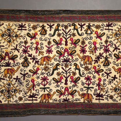 Tiltrækningen ved vintageeksotisme og kunsthåndværk forenes i denne strålende skabelse. Dette mesterværk, fremstillet med omhyggelig opmærksomhed på detaljer, legemliggør en fusion af historie, kultur og håndværksmæssig dygtighed. Tæppet, der består af en blanding af rige stoffer, herunder bomuld, dekoreret med perler, palietter og ædelsten, fortæller historier fra fortiden gennem det indviklede patchwork. Hvert stykke bærer arven fra gamle sarier og etnisk indisk tøj, og viser et kalejdoskop af farver, teksturer og mønstre – et bevis på mangfoldigheden og livligheden i Indiens arv.