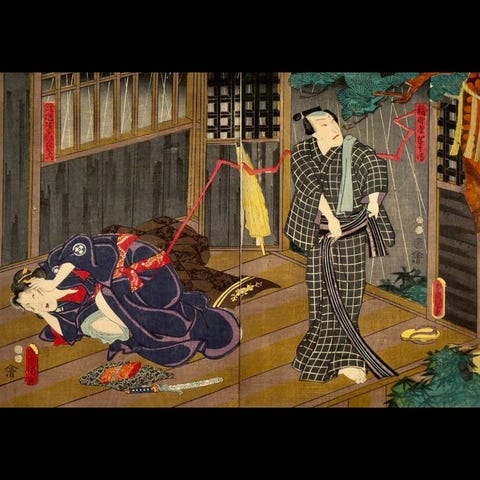 Kunisadas mesterlige brug af stærke farver, udtryksfulde ansigtstræk og teatralsk pose afspejler kabukis stiliserede drama. Den