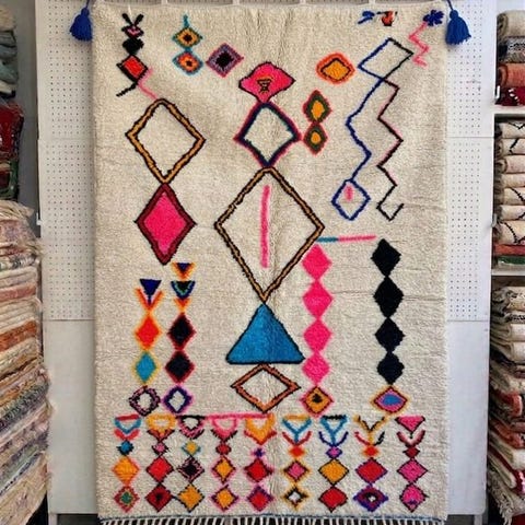 Opdag den autentiske skønhed i dette farverige azilal-berber-tæppe, et unikt stykke vævet i hånden i hjertet af Marokkos Haut-Atlas-bjerge.