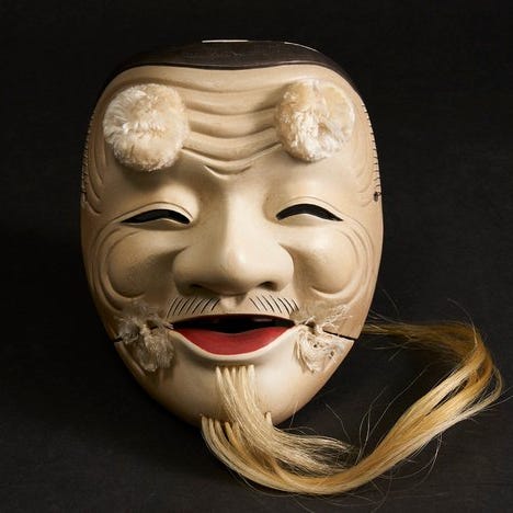 Wooden Okina Noh Sculpture by Ikeda Shuho (池田秀鳳) – Polychrome & Gilt, with Fa...