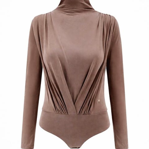 Modellen har en hjerteformet udskæring og et raffineret spil af frontale cut-outs, fremhævet af en centralt drapering, der giver bevægelse og definition til linjen. Stoffet med viscose-udstrækning klæder kroppen elegant og følger harmonisk formerne.