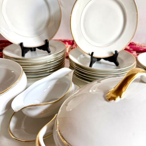 Den raffinerede hvide porcelænslegeme er forstærket af brede forgyldte håndtag, tud og dekorative laurbærsbånds kanter. Designet afspejler den elegante franske borddækningstradition fra midten af det 20. århundrede og forener klassisk inspiration med en modernistisk silhuet.