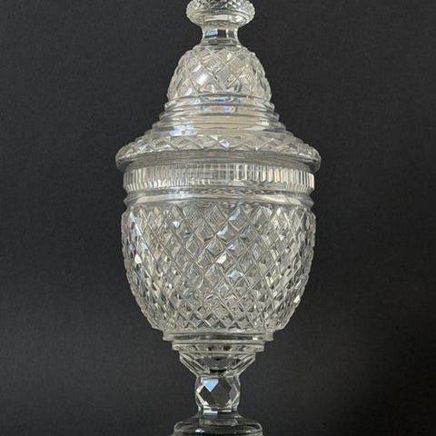 Val Saint Lambert krystalvase, underskrevet M, fra 1990’erne, udadvendt form på en hexagonalt fod, med store facets og diamantspidser over hele overfladen; højde ca. 24 cm, maks diameter ca. 17 cm, fodbredde ca. 12 cm, vægt 2600 g, i fremragende stand. Klik på den blå "gå til varen" knap, for at købe eller byde på denne vare. Den samlede pris vil blive vist inden du afgiver dit bud.