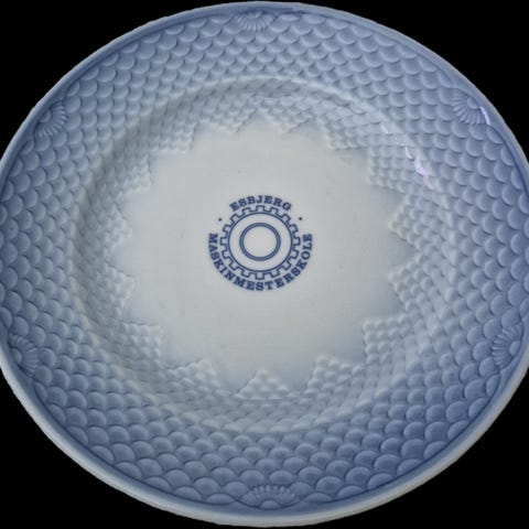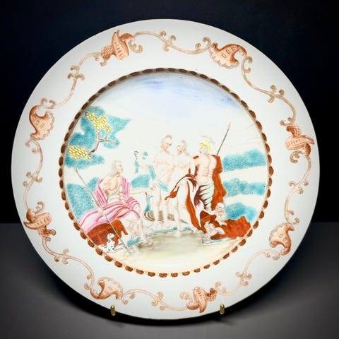 Et fint par 18-tals eksportporcelæns tallerkener med våbenskjold. Centralt monogrammeret skjold under en blå draperet kappe med gyldne frynser. Dekoreret med en neoklassisk 'blue husks'-kant og en savtandskant i guld. Af høj kvalitet porcelæn fra Qianlong/Jiaqing-overgangsperioden.