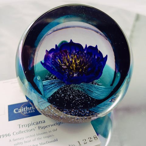 To glas presse-papiers fra Moonflower-serien, håndlavet af Caithness Glass, Skotland, dateret 1998 og 1999, i fremragende stand med æsker og certifikater, hver med sine målinger (Moonflower 98: 5 × 5,8 cm, 259 g; Moonflower 99: 5,1 × 5,7 cm, 245 g). Klik på den blå "gå til varen" knap, for at købe eller byde på denne vare. Den samlede pris vil blive vist inden du afgiver dit bud.
