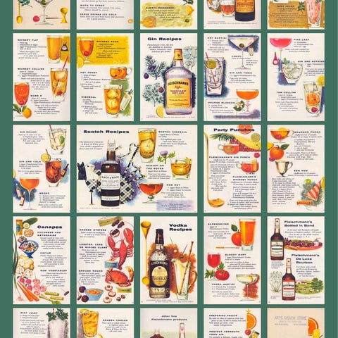 Typisk illustration fra 1940’erne–1950’erne med et farvet grafisk design i to nuancer (grøn og rød), der forestiller en convivial middagsbordsscene og forskellige emballager af mærket.