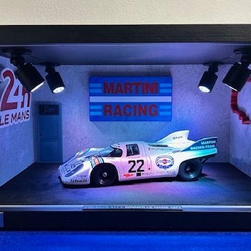Generøst præsenteret i en støvfri valnøddetræsvitrine, fastskruet
