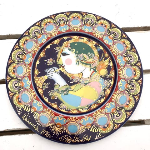 Porcelænsskål designet af Salomé (Wolfgang Ludwig Cihlarz), Tyskland, 1980–1990, udgave 436/3000, titel Leben, Liebe, Hoffnung, diameter 26 cm, dybde 1,5 cm, højde 26 cm, under venstre signeret, i nyt tilstand. Klik på den blå "gå til varen" knap, for at købe eller byde på denne vare. Den samlede pris vil blive vist inden du afgiver dit bud.