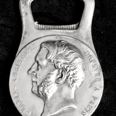 Flaskeåbner i sølvfarvet metal fra Christofle i sit etui.