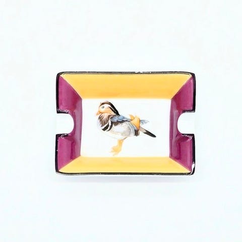 Porcelænsfad af Limoges fra Hermès-servicen kaldet "L'Etrier Perchoir", kendetegnet ved en flerfarvet dekoration med fugle og detaljer inspireret af hesteverdenen. Det centrale motiv forestiller fugle, der sidder på stigbøjler, omgivet af plante motiver.