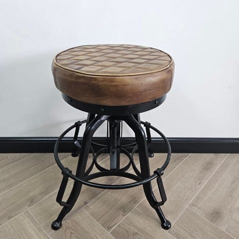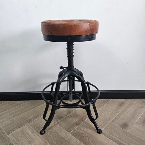 Justerbar italiensk industriel barstol kendetegnet ved et enkelt og funktionelt design, der henviser til den tekniske æstetik fra 70'erne og 80'erne. Strukturen kombinerer kyndigt forskellige materialer: sæde og ryglæn i buet træ med en varm og naturlig tone, centralt støtte i krombelagt metal og en base med fem ben oghjul, udformet for at sikre stabilitet og brugervenlighed.
