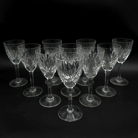 Disse udsøgte glas har en dyb koboltblå skål, rigt skåret med detaljerede stjerneburst- og blomstermotiver, smukt kontrasteret med en klar facetteret stamme og fod. Håndværket afspejler den langvarige tradition inden for fransk luksuskrystalfremstilling.