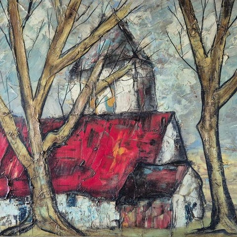 Værket skildrer en scene av moderskab, med stor følelsesmæssig kraft og den karakteristiske brug af farver og materiale.