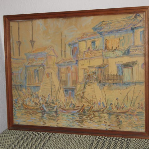 Claude Grosperrin, signeret oliemaling Le Hangar des Gondoles à Burano (Italien), 1964, en original ekspressionistisk bylandskab, 81 × 64 cm, i fremragende stand og sælges med ramme. Klik på den blå "gå til varen" knap, for at købe eller byde på denne vare. Den samlede pris vil blive vist inden du afgiver dit bud.