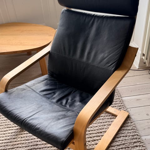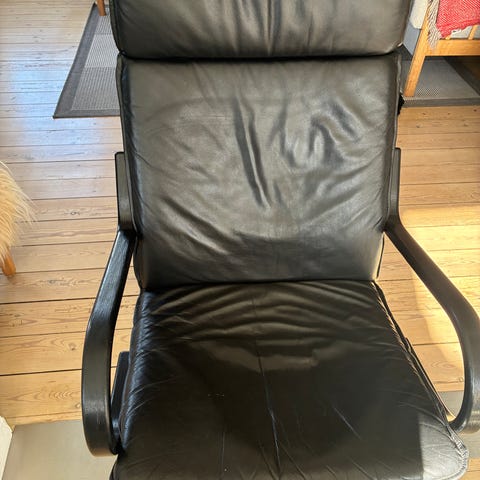 Sælger en flot og komfortabel lænestol i sort læder med lys træramme. Stolen har et tidløst, klassisk udtryk og passer perfekt ind i både moderne og mere traditionelle hjem.