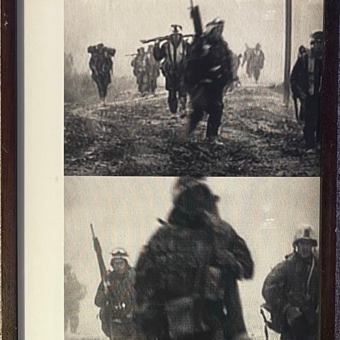 Fotografi med titlen «The destruction of war» taget af den sovjetiske krigsfotograf Mikhail Savin i juli 1943. Billedet viser en ældre mand og hans barnebarn, der går gennem de svedne ruiner af deres tidligere hjem i Ulyanovo, beliggende i Ruslands Kaluga-region. Savin, en fremtrædende frontjournalist under Anden Verdenskrig, var kendt for at dokumentere konfliktens menneskelige omkostninger med fokus på civil modstandsdygtighed og tab. Denne scene tjener som en slående, jordnær registrering af eftervirkningerne af Østfrontens forbrændte virkelighed.