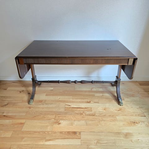 Fint lille mahogni klapbord/spillebord, der også kan bruges som skrivebord. Har en skuffe med messinggreb og slanke ben med fræsede detaljer.