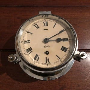 Her er et smukt og sjældent Lip Marine skibsur. Denne klokke stammer ikke kun fra det anerkendte franske mærke Lip, men er også lavet i Tyskland, hvilket gør denne klokke særligt unik for samlere af maritime ure og antikke urværker. Klokken befinder sig i fremragende og fuldt funktionsdygtig stand og er et smukt eksempel på håndværk fra 1960’erne.
