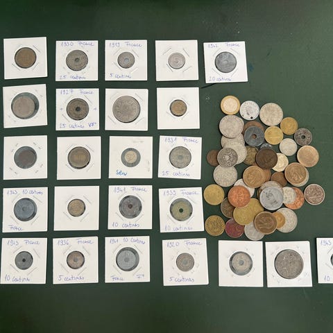 28 meget gamle mønter, herunder også sølvmønter. Mest fra Europa, mange før 1800