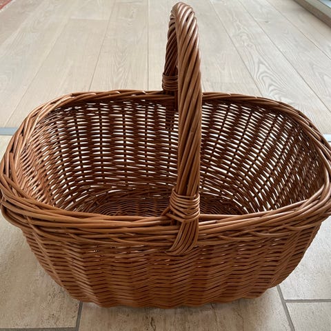 Flettet pilekurv med træhåndtag i begge ender. God som opbevaringskurv til f.eks. brænde, tæpper eller legetøj.