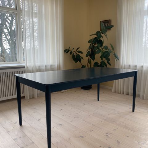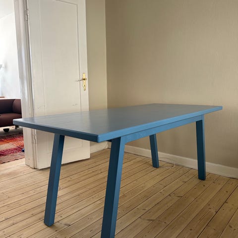Super fint og stabilt teaktræ spisebord med udtræksplader. Bordplade og ben malet i turkis. Kan evt slibes af eller farves en anden farve.